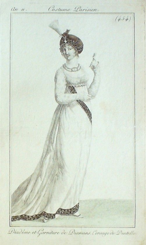 Eau forte authentique aquarellee rehaussee a la main, sur papier velin, issue des edition du journal des dames et des modes fonde en 1797 par Jean-Baptiste Selleque, et repris en 1801 par Pierre de La Mesangere : " Ces toilettes et coiffes representees dressent un panel pointu du costume feminin sous le Directoire, le Consulat et l'Empire ainsi que des costumes masculins. format 120 x 200 Gravure : Diademe & garniture de diamants corsage de dentelle