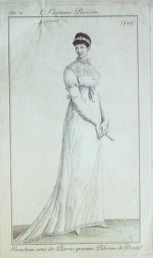Eau forte authentique aquarellee rehaussee a la main, sur papier velin, issue des edition du journal des dames et des modes fonde en 1797 par Jean-Baptiste Selleque, et repris en 1801 par Pierre de La Mesangere : " Ces toilettes et coiffes representees dressent un panel pointu du costume feminin sous le Directoire, le Consulat et l'Empire ainsi que des costumes masculins. format 120 x 200 Gravure : Bandeau orne de pierres gravees. Pelerine de dentelle