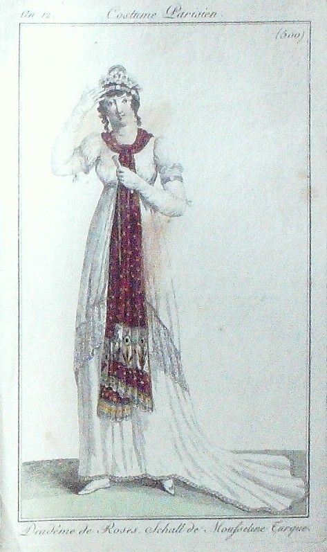 Eau forte authentique aquarellee rehaussee a la main, sur papier velin, issue des edition du journal des dames et des modes fonde en 1797 par Jean-Baptiste Selleque, et repris en 1801 par Pierre de La Mesangere : " Ces toilettes et coiffes representees dressent un panel pointu du costume feminin sous le Directoire, le Consulat et l'Empire ainsi que des costumes masculins. format 120 x 200 Gravure : Schall mousseline Turque, Diademe de roses