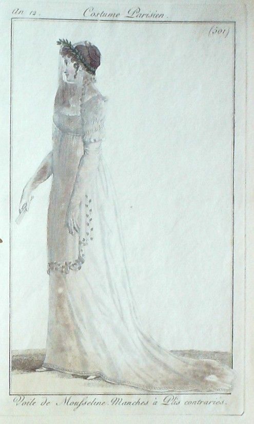 Eau forte authentique aquarellee rehaussee a la main, sur papier velin, issue des edition du journal des dames et des modes fonde en 1797 par Jean-Baptiste Selleque, et repris en 1801 par Pierre de La Mesangere : " Ces toilettes et coiffes representees dressent un panel pointu du costume feminin sous le Directoire, le Consulat et l'Empire ainsi que des costumes masculins. format 120 x 200 Gravure : Voile de mousseline. Manches a plis contraries