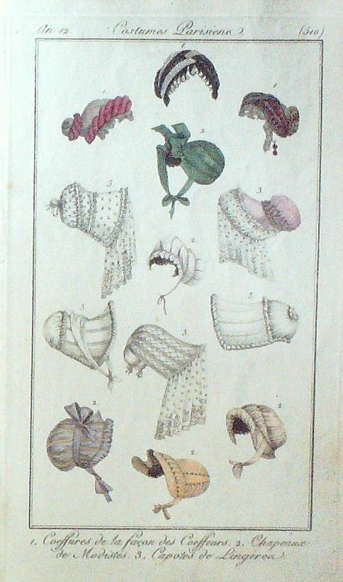 Eau forte authentique aquarellee rehaussee a la main, sur papier velin, issue des edition du journal des dames et des modes fonde en 1797 par Jean-Baptiste Selleque, et repris en 1801 par Pierre de La Mesangere : " Ces toilettes et coiffes representees dressent un panel pointu du costume feminin sous le Directoire, le Consulat et l'Empire ainsi que des costumes masculins. format 120 x 200 Gravure : Chapeaux de modistes. Capotes de lingeres