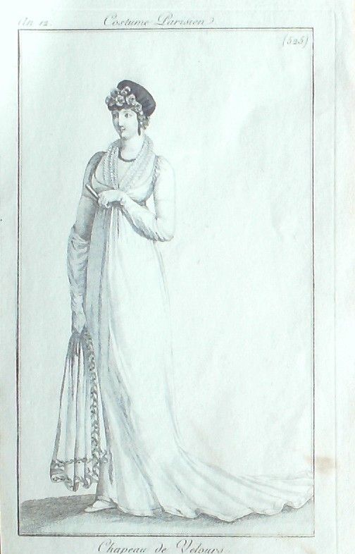 Eau forte authentique aquarellee rehaussee a la main, sur papier velin, issue des edition du journal des dames et des modes fonde en 1797 par Jean-Baptiste Selleque, et repris en 1801 par Pierre de La Mesangere : " Ces toilettes et coiffes representees dressent un panel pointu du costume feminin sous le Directoire, le Consulat et l'Empire ainsi que des costumes masculins. format 120 x 200 Gravure : Chapeau de velours