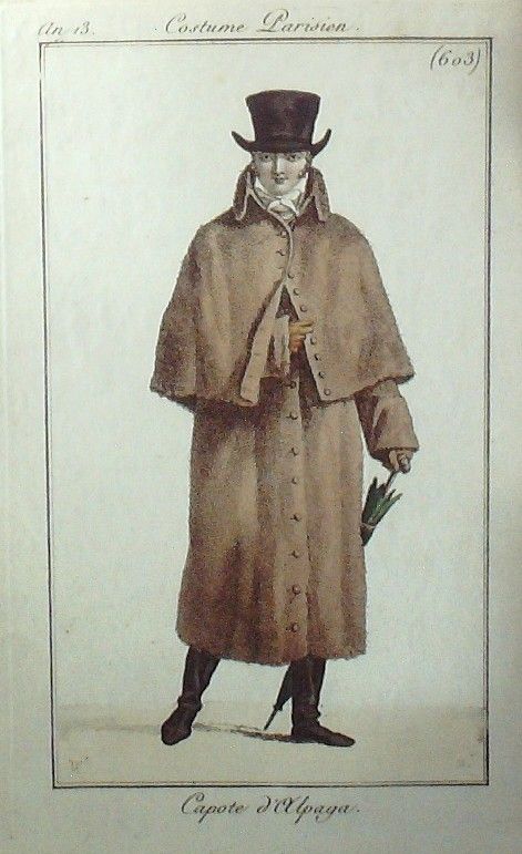Eau forte authentique aquarellee rehaussee a la main, sur papier velin, issue des edition du journal des dames et des modes fonde en 1797 par Jean-Baptiste Selleque, et repris en 1801 par Pierre de La Mesangere : " Ces toilettes et coiffes representees dressent un panel pointu du costume feminin sous le Directoire, le Consulat et l'Empire ainsi que des costumes masculins. format 120 x 200 Gravure : Capote d'Alpaga