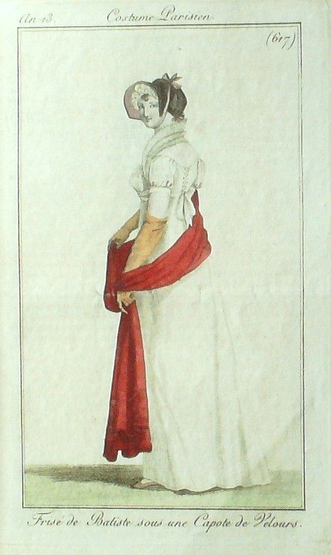 Eau forte authentique aquarellee rehaussee a la main, sur papier velin, issue des edition du journal des dames et des modes fonde en 1797 par Jean-Baptiste Selleque, et repris en 1801 par Pierre de La Mesangere : " Ces toilettes et coiffes representees dressent un panel pointu du costume feminin sous le Directoire, le Consulat et l'Empire ainsi que des costumes masculins. format 120 x 200 Gravure : Frisé de Batiste sous une capote de velours