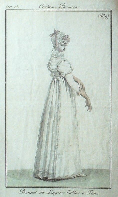 Eau forte authentique aquarellee rehaussee a la main, sur papier velin, issue des edition du journal des dames et des modes fonde en 1797 par Jean-Baptiste Selleque, et repris en 1801 par Pierre de La Mesangere : " Ces toilettes et coiffes representees dressent un panel pointu du costume feminin sous le Directoire, le Consulat et l'Empire ainsi que des costumes masculins. format 120 x 200 Gravure : Bonnet de lingere. Tablier a fichu