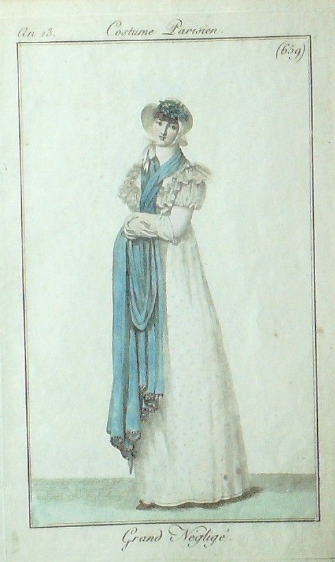 Eau forte authentique aquarellee rehaussee a la main, sur papier velin, issue des edition du journal des dames et des modes fonde en 1797 par Jean-Baptiste Selleque, et repris en 1801 par Pierre de La Mesangere : " Ces toilettes et coiffes representees dressent un panel pointu du costume feminin sous le Directoire, le Consulat et l'Empire ainsi que des costumes masculins. format 120 x 200 Gravure : Grand neglige
