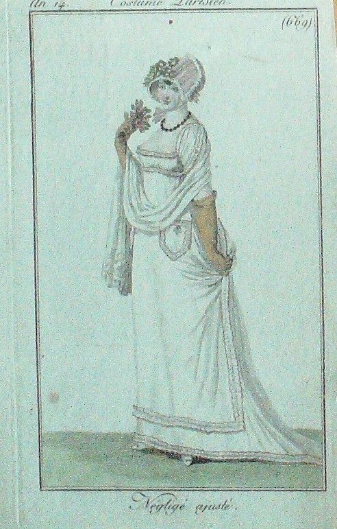 Eau forte authentique aquarellee rehaussee e la main, sur papier velin, issue des edition du journal des dames et des modes fonde en 1797 par Jean-Baptiste Selleque, et repris en 1801 par Pierre de La Mesangere : " Ces toilettes et coiffes representees dressent un panel pointu du costume feminin sous le Directoire, le Consulat et l'Empire ainsi que des costumes masculins. format 120 x 200 Gravure : Neglige ajuste