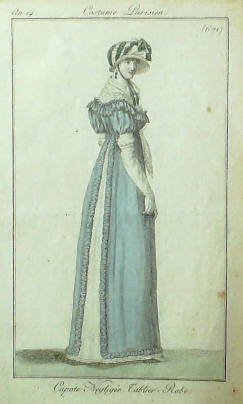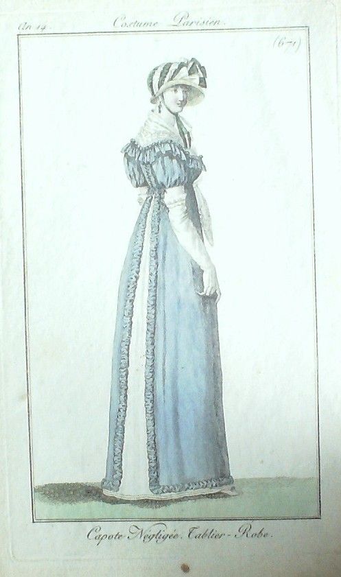 Eau forte authentique aquarellee rehaussee e la main, sur papier velin, issue des edition du journal des dames et des modes fonde en 1797 par Jean-Baptiste Selleque, et repris en 1801 par Pierre de La Mesangere : " Ces toilettes et coiffes representees dressent un panel pointu du costume feminin sous le Directoire, le Consulat et l'Empire ainsi que des costumes masculins. format 120 x 200 Gravure : Capote negligee. Tablier. Robe