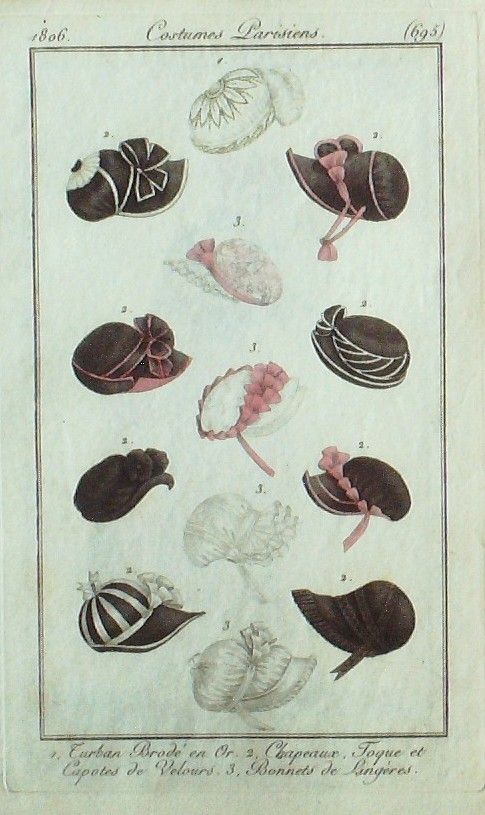 Eau forte authentique aquarellee rehaussee e la main, sur papier velin, issue des edition du journal des dames et des modes fonde en 1797 par Jean-Baptiste Selleque, et repris en 1801 par Pierre de La Mesangere : " Ces toilettes et coiffes representees dressent un panel pointu du costume feminin sous le Directoire, le Consulat et l'Empire ainsi que des costumes masculins. format 120 x 200 Gravure : Turban, Chapeaux, toque et Capote, Bonnets de lingeres