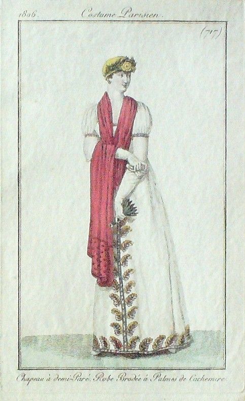Eau forte authentique aquarellee rehaussee e la main, sur papier velin, issue des edition du journal des dames et des modes fonde en 1797 par Jean-Baptiste Selleque, et repris en 1801 par Pierre de La Mesangere : " Ces toilettes et coiffes representees dressent un panel pointu du costume feminin sous le Directoire, le Consulat et l'Empire ainsi que des costumes masculins. format 120 x 200 Gravure : Chapeau e a‚ demi pare. Robe brodee e a‚ palmes de Cachemire