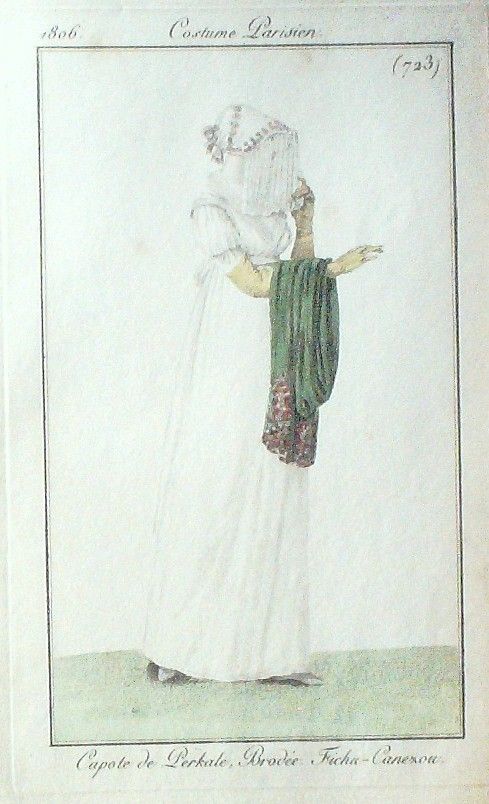 Eau forte authentique aquarellee rehaussee e la main, sur papier velin, issue des edition du journal des dames et des modes fonde en 1797 par Jean-Baptiste Selleque, et repris en 1801 par Pierre de La Mesangere : " Ces toilettes et coiffes representees dressent un panel pointu du costume feminin sous le Directoire, le Consulat et l'Empire ainsi que des costumes masculins. format 120 x 200 Gravure : Capote de Perkale brodee. Fichu. Canezou