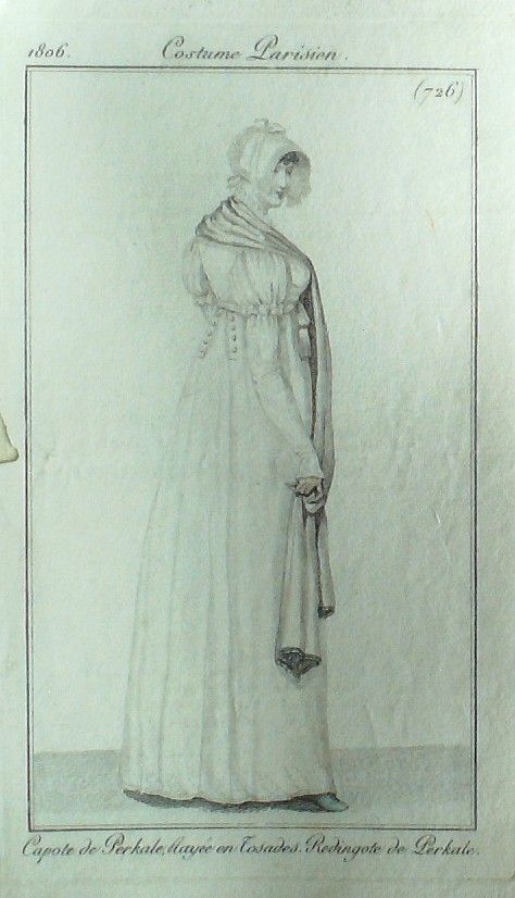 Eau forte authentique aquarellee rehaussee e la main, sur papier velin, issue des edition du journal des dames et des modes fonde en 1797 par Jean-Baptiste Selleque, et repris en 1801 par Pierre de La Mesangere : " Ces toilettes et coiffes representees dressent un panel pointu du costume feminin sous le Directoire, le Consulat et l'Empire ainsi que des costumes masculins. format 120 x 200 Gravure : Capote de Perkale rayee en torsades. Redingote de Perkale