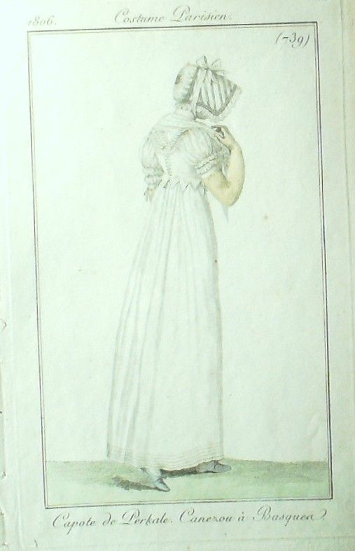 Eau forte authentique aquarellee rehaussee e la main, sur papier velin, issue des edition du journal des dames et des modes fonde en 1797 par Jean-Baptiste Selleque, et repris en 1801 par Pierre de La Mesangere : " Ces toilettes et coiffes representees dressent un panel pointu du costume feminin sous le Directoire, le Consulat et l'Empire ainsi que des costumes masculins. format 120 x 200 Gravure : Canezou e Basques, capote de Perkale