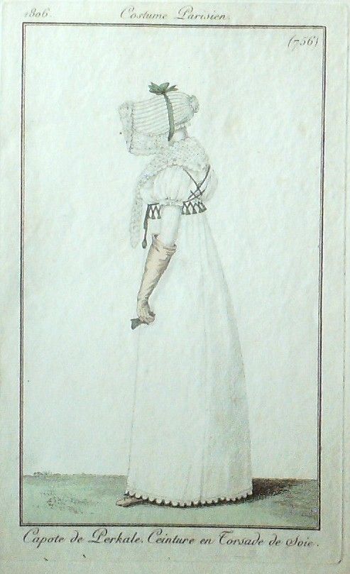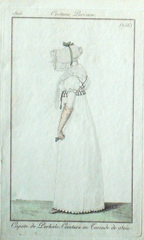 Eau forte authentique aquarellee rehaussee e la main, sur papier velin, issue des edition du journal des dames et des modes fonde en 1797 par Jean-Baptiste Selleque, et repris en 1801 par Pierre de La Mesangere : " Ces toilettes et coiffes representees dressent un panel pointu du costume feminin sous le Directoire, le Consulat et l'Empire ainsi que des costumes masculins. format 120 x 200 Gravure : Capote de Perkale. Ceinture en torsade de soie