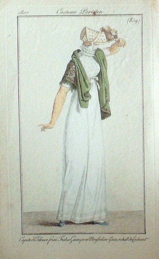 Eau forte authentique aquarellee rehaussee e la main, sur papier velin, issue des edition du journal des dames et des modes fonde en 1797 par Jean-Baptiste Selleque, et repris en 1801 par Pierre de La Mesangere : Ces toilettes et coiffes representees dressent un panel pointu du costume feminin sous le Directoire, le Consulat et l'Empire ainsi que des costumes masculins. format 120 x 200 Gravure : Capote de velours frise. Fichu Guimpe en mousseline, gaze Schall de Cachemire