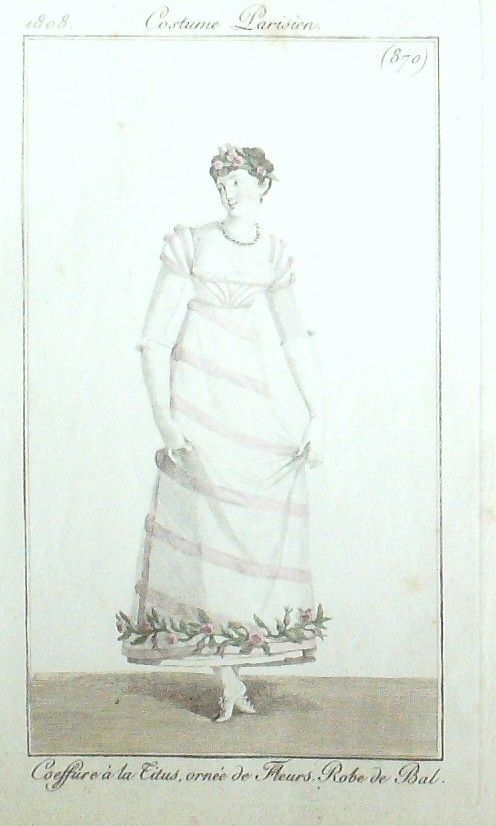 Eau forte authentique aquarellee rehaussee e la main, sur papier velin, issue des edition du journal des dames et des modes fonde en 1797 par Jean-Baptiste Selleque, et repris en 1801 par Pierre de La Mesangere : Ces toilettes et coiffes representees dressent un panel pointu du costume feminin sous le Directoire, le Consulat et l'Empire ainsi que des costumes masculins. format 120 x 200 Gravure : Robe de bal coiffure e a‚ la Titus