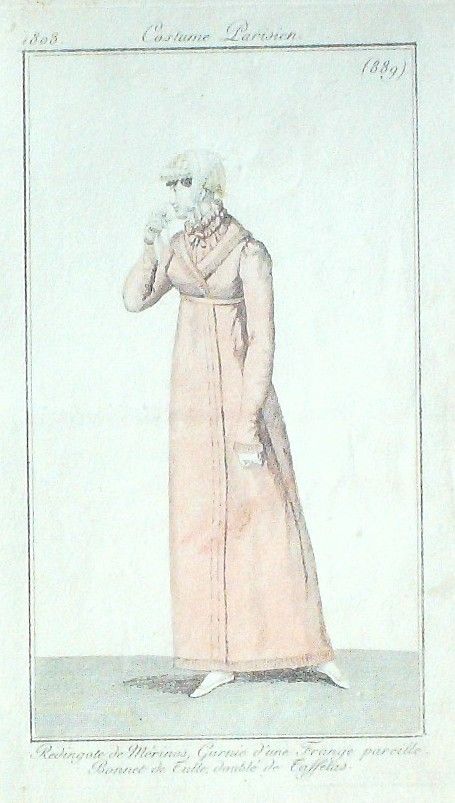 Eau forte authentique aquarellee rehaussee e la main, sur papier velin, issue des edition du journal des dames et des modes fonde en 1797 par Jean-Baptiste Selleque, et repris en 1801 par Pierre de La Mesangere : Ces toilettes et coiffes representees dressent un panel pointu du costume feminin sous le Directoire, le Consulat et l'Empire ainsi que des costumes masculins. format 120 x 200 Gravure : Redingote de Merinos garnie d'une frange pareille.e‚a‚ Bonnet de tulle double de taffetas