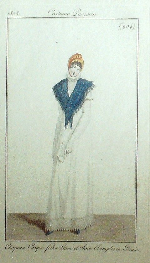 Eau forte authentique aquarellee rehaussee e la main, sur papier velin, issue des edition du journal des dames et des modes fonde en 1797 par Jean-Baptiste Selleque, et repris en 1801 par Pierre de La Mesangere : Ces toilettes et coiffes representees dressent un panel pointu du costume feminin sous le Directoire, le Consulat et l'Empire ainsi que des costumes masculins. format 120 x 200 Gravure : Chapeau casque . Fichu laine et soie remplis en biais