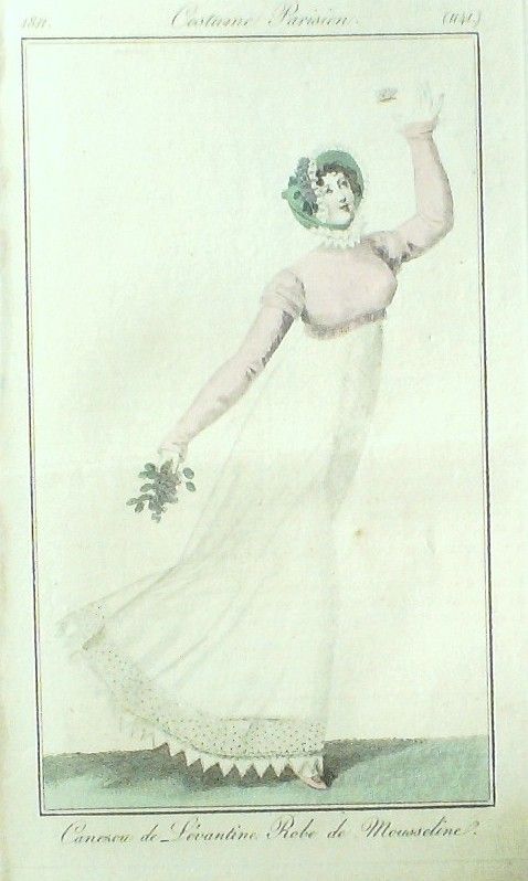 Eau forte authentique aquarellee rehaussee e la main, sur papier velin, issue des edition du journal des dames et des modes fonde en 1797 par Jean-Baptiste Selleque, et repris en 1801 par Pierre de La Mesangere : Ces toilettes et coiffes representees dressent un panel pointu du costume feminin sous le Directoire, le Consulat et l'Empire ainsi que des costumes masculins. format 120 x 200 Gravure : Canezou de Levantine. Robe de mousseline