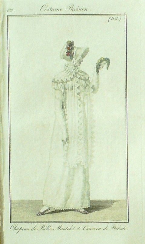 Eau forte authentique aquarellee rehaussee e la main, sur papier velin, issue des edition du journal des dames et des modes fonde en 1797 par Jean-Baptiste Selleque, et repris en 1801 par Pierre de La Mesangere : Ces toilettes et coiffes representees dressent un panel pointu du costume feminin sous le Directoire, le Consulat et l'Empire ainsi que des costumes masculins. format 120 x 200 Gravure : Chapeau de paille. Mantelet et Canezou de Perkale