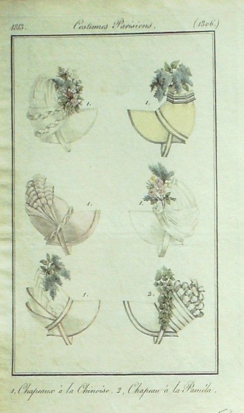 Eau forte authentique aquarellee rehaussee e la main, sur papier velin, issue des edition du journal des dames et des modes fonde en 1797 par Jean-Baptiste Selleque, et repris en 1801 par Pierre de La Mesangere : Ces toilettes et coiffes representees dressent un panel pointu du costume feminin sous le Directoire, le Consulat et l'Empire ainsi que des costumes masculins. format 120 x 200 Gravure : Chapeaux Chinois & Pamela