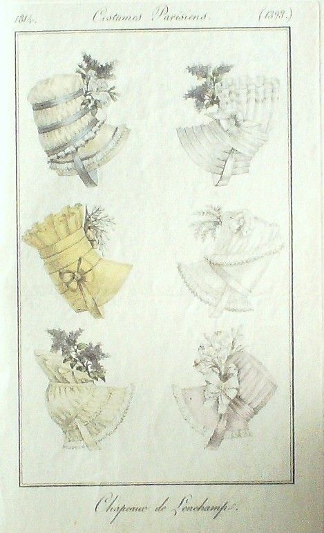 Eau forte authentique aquarellee rehaussee e la main, sur papier velin, issue des edition du journal des dames et des modes fonde en 1797 par Jean-Baptiste Selleque, et repris en 1801 par Pierre de La Mesangere : Ces toilettes et coiffes representees dressent un panel pointu du costume feminin sous le Directoire, le Consulat et l'Empire ainsi que des costumes masculins. format 120 x 200 Gravure : Chapeaux de Longchamp