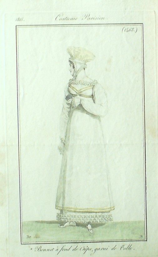 Eau forte authentique aquarellee rehaussee e la main, sur papier velin, issue des edition du journal des dames et des modes fonde en 1797 par Jean-Baptiste Selleque, et repris en 1801 par Pierre de La Mesangere : Ces toilettes et coiffes representees dressent un panel pointu du costume feminin sous le Directoire, le Consulat et l'Empire ainsi que des costumes masculins. format 120 x 200 Gravure : Bonnet de creªpe garni de tulle