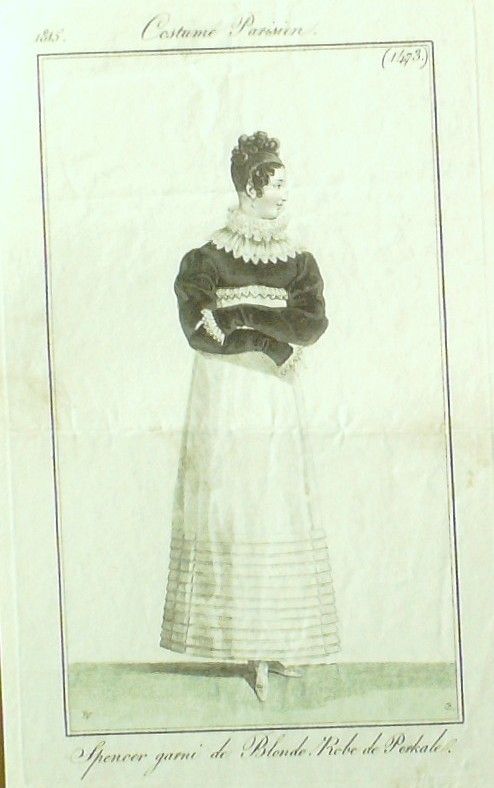 Eau forte authentique aquarellee rehaussee e la main, sur papier velin, issue des edition du journal des dames et des modes fonde en 1797 par Jean-Baptiste Selleque, et repris en 1801 par Pierre de La Mesangere : Ces toilettes et coiffes representees dressent un panel pointu du costume feminin sous le Directoire, le Consulat et l'Empire ainsi que des costumes masculins. format 120 x 200 Gravure : Spencer garni de blonde Robe de Perkale