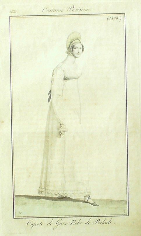 Eau forte authentique aquarellee rehaussee e la main, sur papier velin, issue des edition du journal des dames et des modes fonde en 1797 par Jean-Baptiste Selleque, et repris en 1801 par Pierre de La Mesangere : Ces toilettes et coiffes representees dressent un panel pointu du costume feminin sous le Directoire, le Consulat et l'Empire ainsi que des costumes masculins. format 120 x 200 Gravure : Capote de gaze. Robe de perkale