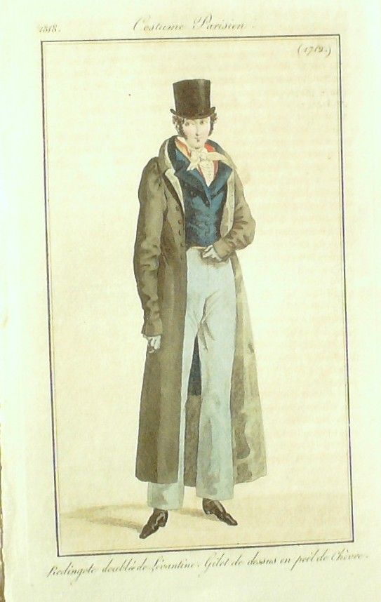 Eau forte authentique aquarellee rehaussee e la main, sur papier velin, issue des edition du journal des dames et des modes fonde en 1797 par Jean-Baptiste Selleque, et repris en 1801 par Pierre de La Mesangere :: Redingote doublee de Levantine, gilet de dessus en poil de chevre