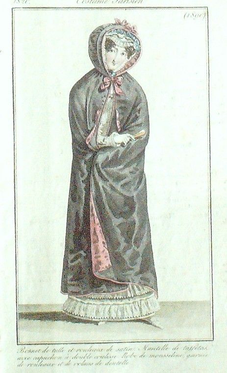 Eau forte authentique aquarellee rehaussee e la main, sur papier velin, issue des edition du journal des dames et des modes fonde en 1797 par Jean-Baptiste Selleque, et repris en 1801 par Pierre de La Mesangere : Ces toilettes et coiffes representees dressent un panel pointu du costume feminin sous le Directoire, le Consulat et l'Empire ainsi que des costumes masculins. format 120 x 200 Gravure : Mantille de Taffetas, avec capuchn e double coulisse, robe mousseline garnie de rouleaux et velours de dentelle, bonnet de tulle