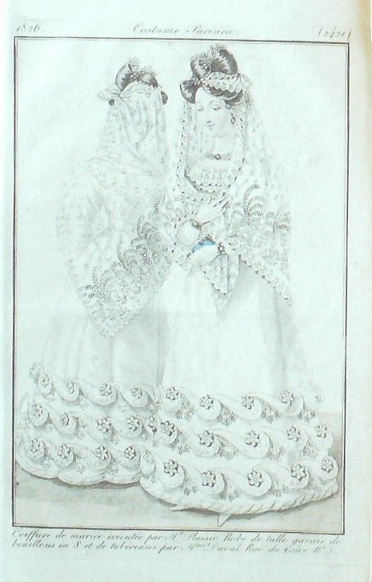 Eau forte authentique aquarellee rehaussee e la main, sur papier velin, issue des edition du journal des dames et des modes fonde en 1797 par Jean-Baptiste Selleque, et repris en 1801 par Pierre de La Mesangere : Ces toilettes et coiffes representees dressent un panel pointu du costume feminin sous le Directoire, le Consulat et l'Empire ainsi que des costumes masculins. format 120 x 200 Gravure : Robe de tulle garnie de bouillons et tubereuses, coiffure de mariee.