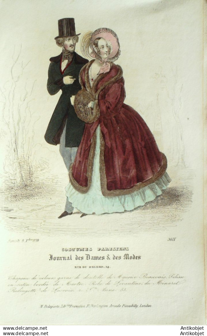 Gravure Mode Costume Parisien 1838 # 3611 (eau forte old Fashion plate