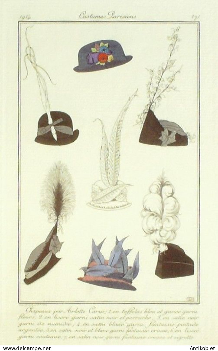Eau forte authentique aquarellee rehaussee a la main, sur papier velin, issue des edition du journal des dames et des modes fonde en 1797 par Jean-Baptiste Selleque, et repris en 1801 par Pierre de La Mesangere : Ces toilettes et coiffes representees dressent un panel pointu du costume feminin sous le Directoire, le Consulat et l'Empire ainsi que des costumes masculins. format 120 x 200 Gravure : ANONYME-Chapeaux par Arlette Carus Taffetas, satin (pl.171 Journal des Dames et des Modes 1914 n°73)