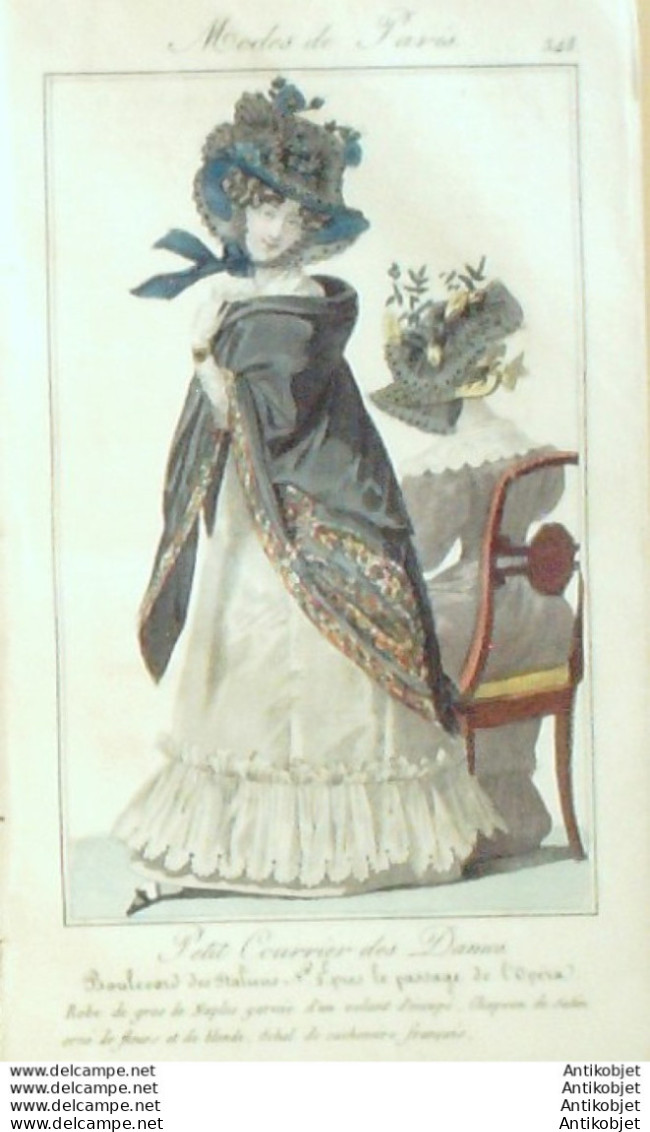 Gravure originale cuivre gravure couleur main, de l'epoque signuree et numureroturee, format 130 x 210. Ce modele repreresente : Robe gros de Naples garnie de volant durecoupure chapeau de satin ornure de fleurs et de blonde schal de cachemire frana§ais