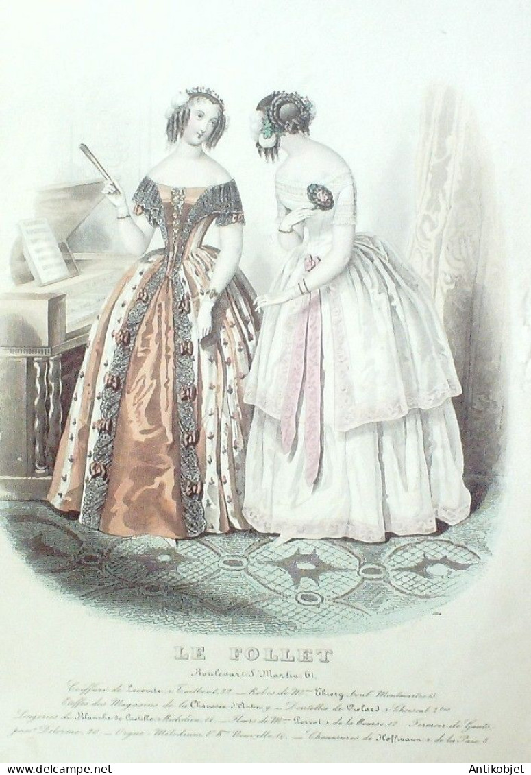 Gravure Mode Le Follet 1843 # 1214 (aquarelle Old Fashion plate)
