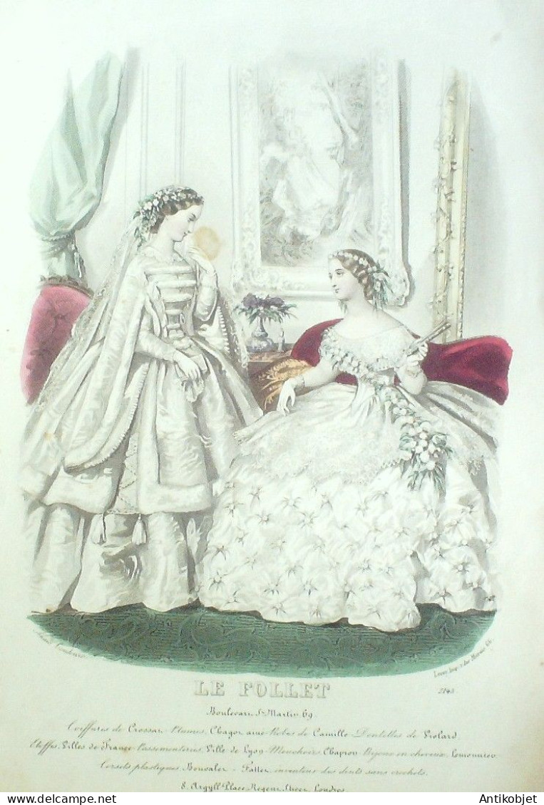Gravure Mode Le Follet 1860 # 2145 (aquarelle Old Fashion plate)