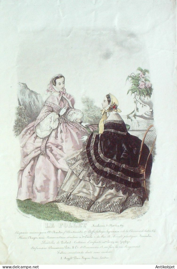 Gravure Mode Le Follet 1860 # 2173 (aquarelle Old Fashion plate)