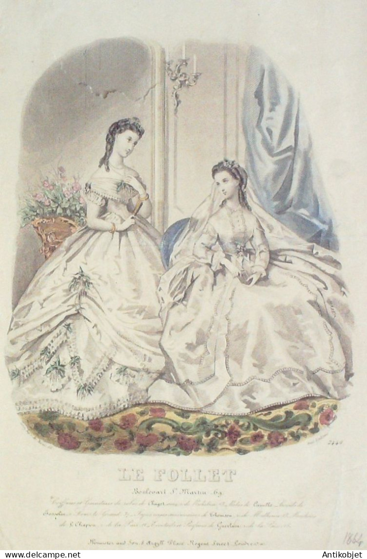 Gravure Mode Le Follet 1864 # 2440 (aquarelle Old Fashion plate)