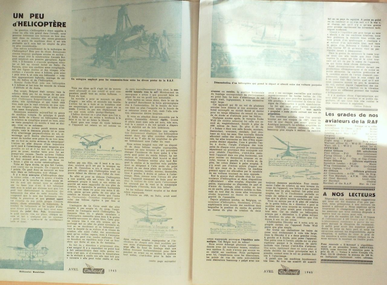 Revue illustrée de 16 pages constituée de photos d'appareils, plan, caractéristiques techniques, Aéroclubs Sommaire : Les avions de chasse allemands, la Suprématie Aérienne, maquette volante de l'Auto-Stable, vol plané, Plan Potez 63, Hélicoptères grades de nos aviateurs RAF, Aérotaxis, le moteur phases, formation des pilotes, performances du Caster, construire un micromoteur pièces en Duralumin, Biplace de tourisme Cricri-Salmson,