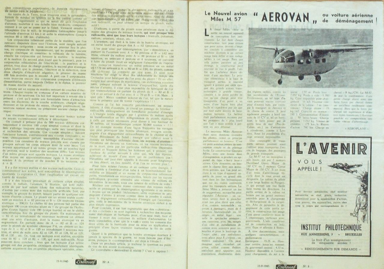Revue mensuelle belge d'avions illustré de l'aéronautique mondiale en 16 pages . Sommaire : A quand une aviation belge, le Hawker Typhoon, Anvers sous les v et V2, la bombe atomique, Miles M 57 Aerovan voiture aérienne, avions auto-stable Canard, Skycar, Henry Mignet, retour des américains aux Philippines, Avions citernes essai du Skysser