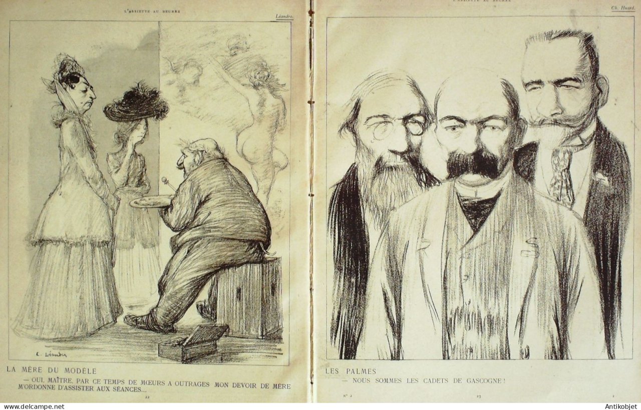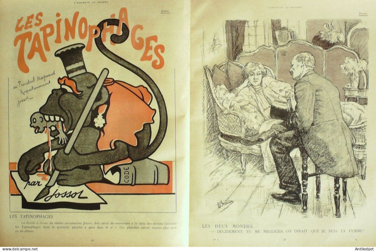 Magazine hebdomadaire satirique rare et recherche, illustre en francais par des dessinateurs anarchistes abordant les themes : l'anticlericalisme, l'antimilitarisme, l'anticolonialisme et la critique de la police et des tribunaux. Ouvrage paru de 1901 a 1936. 16 pages constituees de nombreuses illustrations couleurs et noir et blanc. (dessinateurs : Jean Veber, Charles Leandre, Jossot, Steinlein, Jacques Villon, Chares Huard, Vogel, Jeanniot, Ibels, Kupka, Roubille,Hermann-Paul,Thomas Leal da Camara,Felix Vallotton.Bogislas, etienne Le Rallic, Delannoy, Ricardo Flores, Galanis, Grandjouan, , Georges d'Ostoya, Maurice Radiguet, Demetrios Galanis, Juan Gris, Walter Crane, Alfred Kubin. Ayant publie pres de 10 000 dessins produits par environ 200 dessinateurs, elle constitue un precieux temoignage iconographique sur la Belle epoque. Complet et en tres bon etat. Ce n'est pas un numero issu d'une reliure donc non rogne. Chaque litho est pleine marge entierement