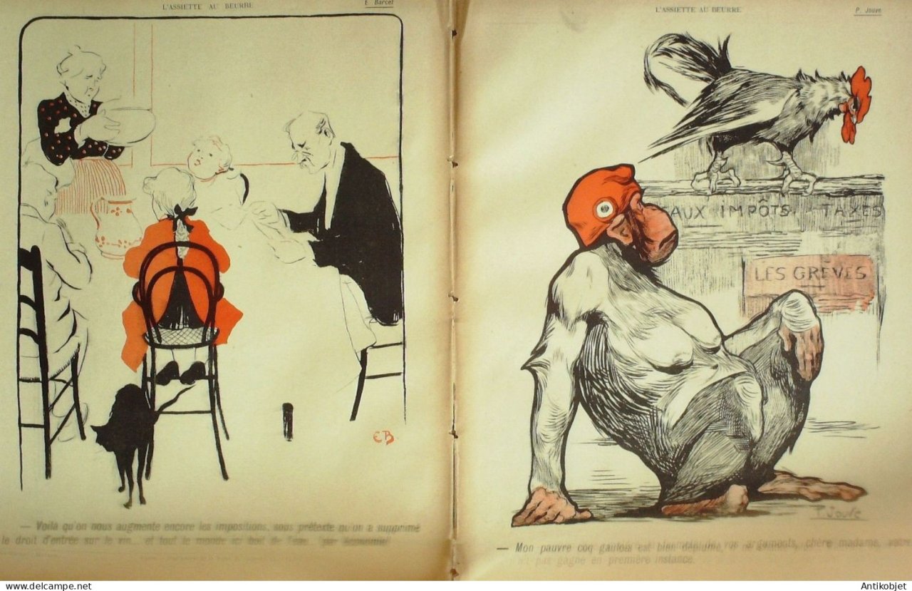 Magazine hebdomadaire satirique rare et recherche, illustre en francais par des dessinateurs anarchistes abordant les themes : l'anticlericalisme, l'antimilitarisme, l'anticolonialisme et la critique de la police et des tribunaux. Ouvrage paru de 1901 a 1936. 16 pages constituees de nombreuses illustrations couleurs et noir et blanc. (dessinateurs : Jean Veber, Charles Leandre, Jossot, Steinlein, Jacques Villon, Chares Huard, Vogel, Jeanniot, Ibels, Kupka, Roubille,Hermann-Paul,Thomas Leal da Camara,Felix Vallotton.Bogislas, etienne Le Rallic, Delannoy, Ricardo Flores, Galanis, Grandjouan, , Georges d'Ostoya, Maurice Radiguet, Demetrios Galanis, Juan Gris, Walter Crane, Alfred Kubin. Ayant publie pres de 10 000 dessins produits par environ 200 dessinateurs, elle constitue un precieux temoignage iconographique sur la Belle epoque. Complet et en tres bon etat. Ce n'est pas un numero issu d'une reliure donc non rogne. Chaque litho est pleine marge entierement