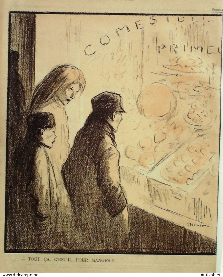 Magazine hebdomadaire satirique rare et recherche, illustre en francais par des dessinateurs anarchistes abordant les themes : l'anticlericalisme, l'antimilitarisme, l'anticolonialisme et la critique de la police et des tribunaux. Ouvrage paru de 1901 a 1936. 16 pages constituees de nombreuses illustrations couleurs et noir et blanc. (dessinateurs : Jean Veber, Charles Leandre, Jossot, Steinlein, Jacques Villon, Chares Huard, Vogel, Jeanniot, Ibels, Kupka, Roubille,Hermann-Paul,Thomas Leal da Camara,Felix Vallotton.Bogislas, etienne Le Rallic, Delannoy, Ricardo Flores, Galanis, Grandjouan, , Georges d'Ostoya, Maurice Radiguet, Demetrios Galanis, Juan Gris, Walter Crane, Alfred Kubin. Ayant publie pres de 10 000 dessins produits par environ 200 dessinateurs, elle constitue un precieux temoignage iconographique sur la Belle epoque. Complet et en tres bon etat. Ce n'est pas un numero issu d'une reliure donc non rogne. Chaque litho est pleine marge entierement