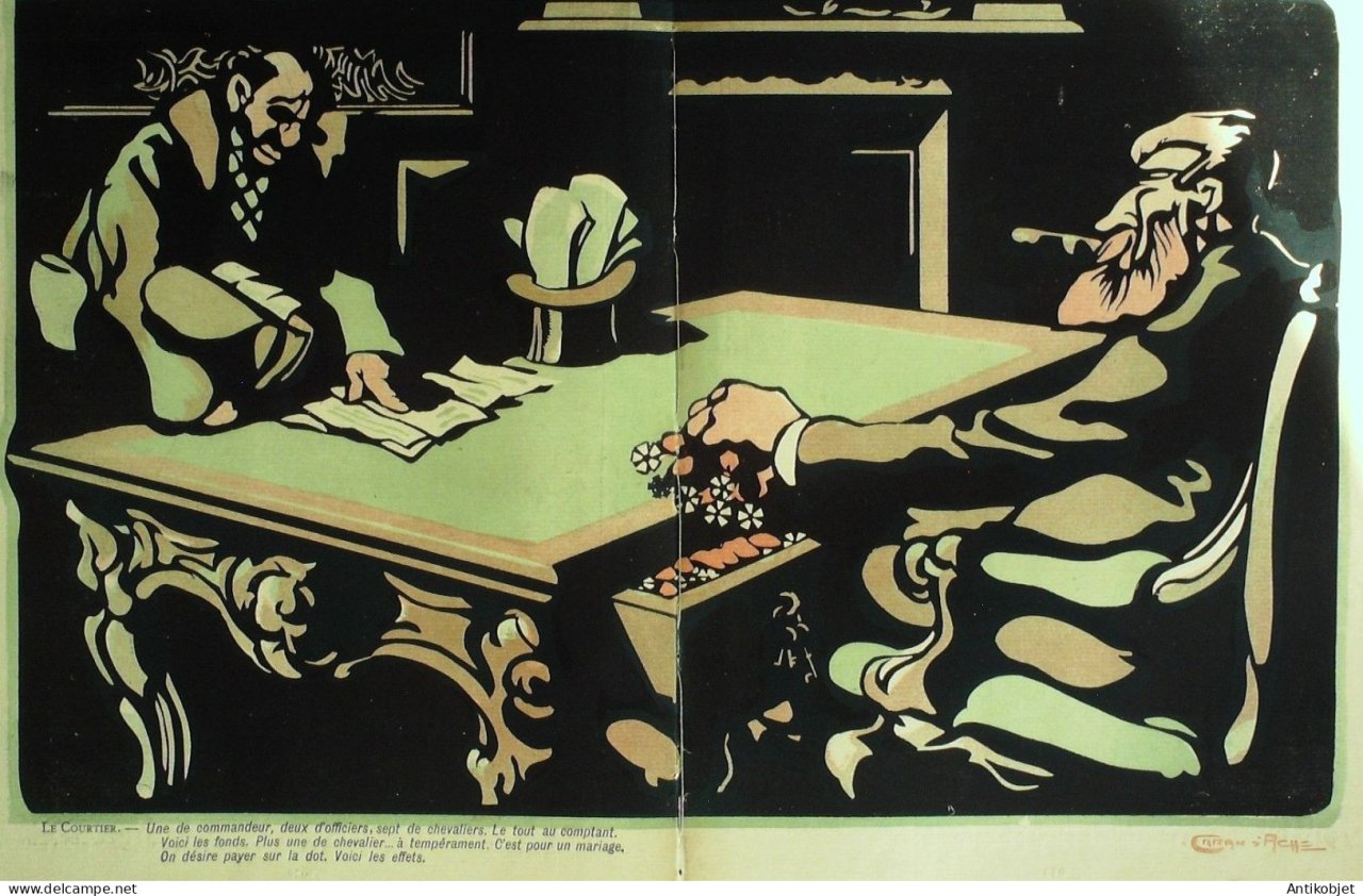 Magazine hebdomadaire satirique rare et recherche, illustre en francais par des dessinateurs anarchistes abordant les themes : l'anticlericalisme, l'antimilitarisme, l'anticolonialisme et la critique de la police et des tribunaux. Ouvrage paru de 1901 a 1936. 16 pages constituees de nombreuses illustrations couleurs et noir et blanc. (dessinateurs : Jean Veber, Charles Leandre, Jossot, Steinlein, Jacques Villon, Chares Huard, Vogel, Jeanniot, Ibels, Kupka, Roubille,Hermann-Paul,Thomas Leal da Camara,Felix Vallotton.Bogislas, etienne Le Rallic, Delannoy, Ricardo Flores, Galanis, Grandjouan, , Georges d'Ostoya, Maurice Radiguet, Demetrios Galanis, Juan Gris, Walter Crane, Alfred Kubin. Ayant publie pres de 10 000 dessins produits par environ 200 dessinateurs, elle constitue un precieux temoignage iconographique sur la Belle epoque. Complet et en tres bon etat. Ce n'est pas un numero issu d'une reliure donc non rogne. Chaque litho est pleine marge entierement