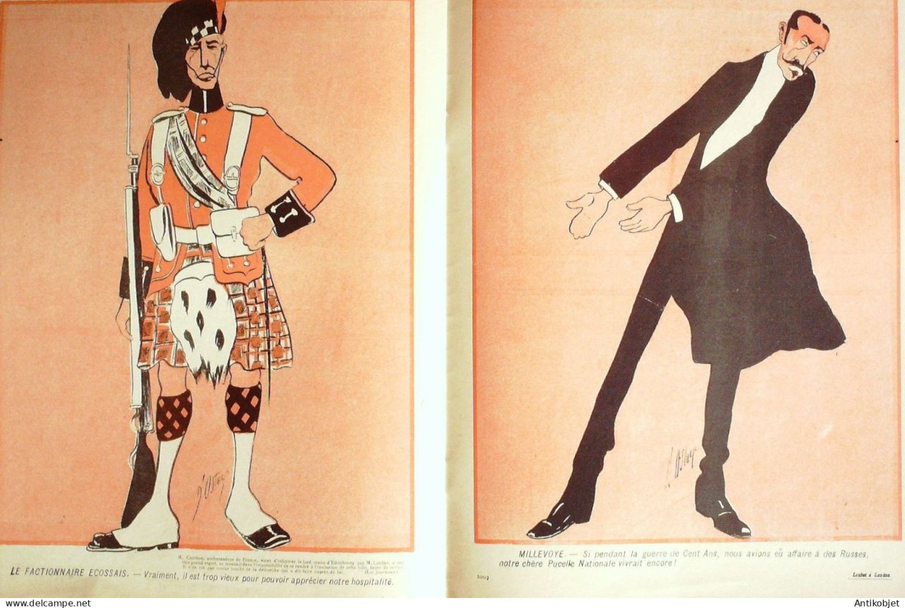 Magazine hebdomadaire satirique rare et recherche, illustre en francais par des dessinateurs anarchistes abordant les themes : l'anticlericalisme, l'antimilitarisme, l'anticolonialisme et la critique de la police et des tribunaux. Ouvrage paru de 1901 a 1936. 16 pages constituees de nombreuses illustrations couleurs et noir et blanc. (dessinateurs : Jean Veber, Charles Leandre, Jossot, Steinlein, Jacques Villon, Chares Huard, Vogel, Jeanniot, Ibels, Kupka, Roubille,Hermann-Paul,Thomas Leal da Camara,Felix Vallotton.Bogislas, etienne Le Rallic, Delannoy, Ricardo Flores, Galanis, Grandjouan, , Georges d'Ostoya, Maurice Radiguet, Demetrios Galanis, Juan Gris, Walter Crane, Alfred Kubin. Ayant publie pres de 10 000 dessins produits par environ 200 dessinateurs, elle constitue un precieux temoignage iconographique sur la Belle epoque. Complet et en tres bon etat. Ce n'est pas un numero issu d'une reliure donc non rogne. Chaque litho est pleine marge entierement