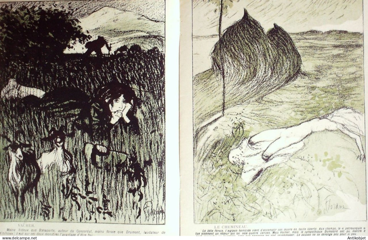 Magazine hebdomadaire satirique rare et recherche, illustre en francais par des dessinateurs anarchistes abordant les themes : l'anticlericalisme, l'antimilitarisme, l'anticolonialisme et la critique de la police et des tribunaux. Ouvrage paru de 1901 a 1936. 16 pages constituees de nombreuses illustrations couleurs et noir et blanc. (dessinateurs : Jean Veber, Charles Leandre, Jossot, Steinlein, Jacques Villon, Chares Huard, Vogel, Jeanniot, Ibels, Kupka, Roubille,Hermann-Paul,Thomas Leal da Camara,Felix Vallotton.Bogislas, etienne Le Rallic, Delannoy, Ricardo Flores, Galanis, Grandjouan, , Georges d'Ostoya, Maurice Radiguet, Demetrios Galanis, Juan Gris, Walter Crane, Alfred Kubin. Ayant publie pres de 10 000 dessins produits par environ 200 dessinateurs, elle constitue un precieux temoignage iconographique sur la Belle epoque. Complet et en tres bon etat. Ce n'est pas un numero issu d'une reliure donc non rogne. Chaque litho est pleine marge entierement