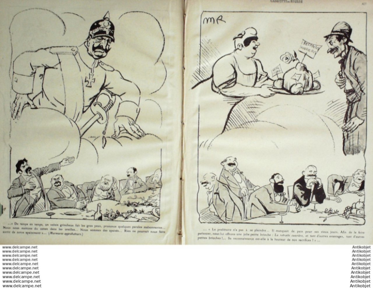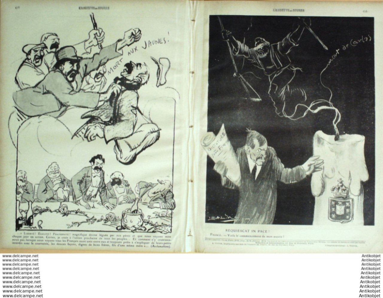 Magazine hebdomadaire satirique rare et recherche, illustre en francais par des dessinateurs anarchistes abordant les themes : l'anticlericalisme, l'antimilitarisme, l'anticolonialisme et la critique de la police et des tribunaux. Ouvrage paru de 1901 a 1936. 16 pages constituees de nombreuses illustrations couleurs et noir et blanc. (dessinateurs : Jean Veber, Charles Leandre, Jossot, Steinlein, Jacques Villon, Chares Huard, Vogel, Jeanniot, Ibels, Kupka, Roubille,Hermann-Paul,Thomas Leal da Camara,Felix Vallotton.Bogislas, etienne Le Rallic, Delannoy, Ricardo Flores, Galanis, Grandjouan, , Georges d'Ostoya, Maurice Radiguet, Demetrios Galanis, Juan Gris, Walter Crane, Alfred Kubin. Ayant publie pres de 10 000 dessins produits par environ 200 dessinateurs, elle constitue un precieux temoignage iconographique sur la Belle epoque. Complet et en tres bon etat. Ce n'est pas un numero issu d'une reliure donc non rogne. Chaque litho est pleine marge entierement