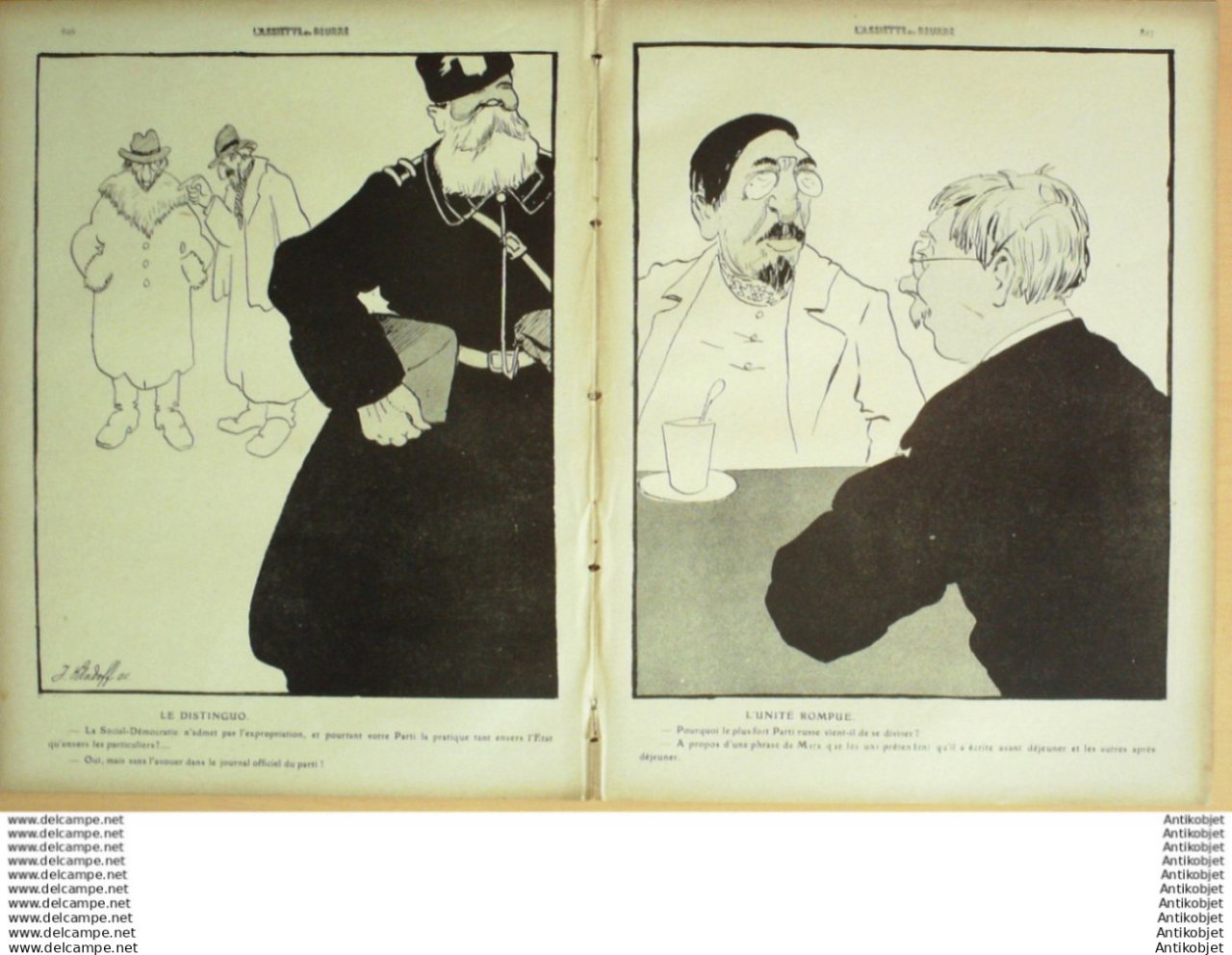 Magazine hebdomadaire satirique rare et recherche, illustre en francais par des dessinateurs anarchistes abordant les themes : l'anticlericalisme, l'antimilitarisme, l'anticolonialisme et la critique de la police et des tribunaux. Ouvrage paru de 1901 a 1936. 16 pages constituees de nombreuses illustrations couleurs et noir et blanc. (dessinateurs : Jean Veber, Charles Leandre, Jossot, Steinlein, Jacques Villon, Chares Huard, Vogel, Jeanniot, Ibels, Kupka, Roubille,Hermann-Paul,Thomas Leal da Camara,Felix Vallotton.Bogislas, etienne Le Rallic, Delannoy, Ricardo Flores, Galanis, Grandjouan, , Georges d'Ostoya, Maurice Radiguet, Demetrios Galanis, Juan Gris, Walter Crane, Alfred Kubin. Ayant publie pres de 10 000 dessins produits par environ 200 dessinateurs, elle constitue un precieux temoignage iconographique sur la Belle epoque. Complet et en tres bon etat. Ce n'est pas un numero issu d'une reliure donc non rogne. Chaque litho est pleine marge entierement