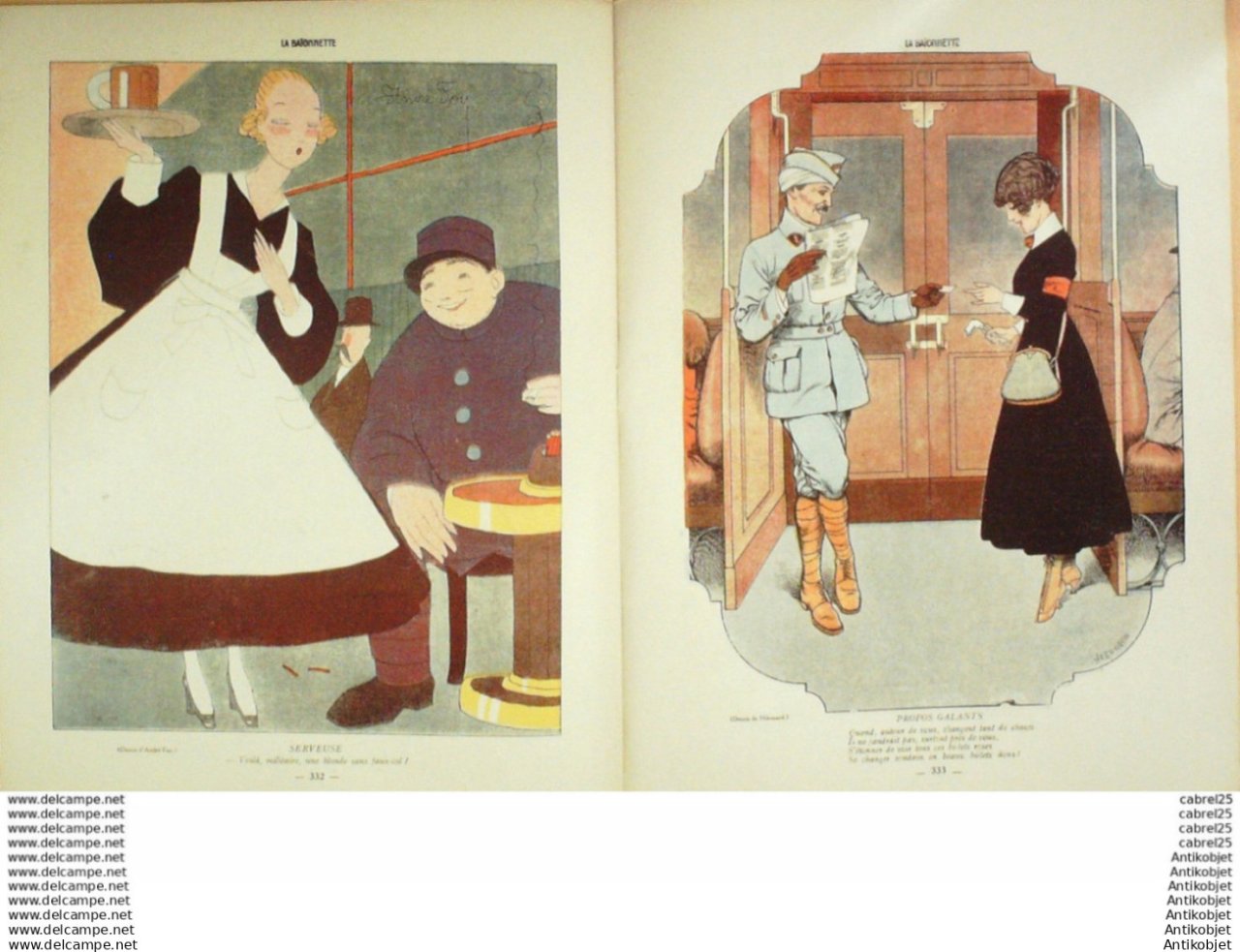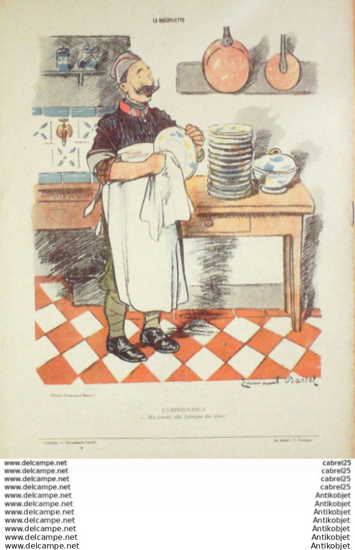 Periodique authentique de 16 pages richement illustrees en couleurs de caricatures humoristiques et satiriques fut cree l'origine "x la baionnette" le 23 janvier 1915 par le dessinateur Henri Maigrot, dit Henriot , collaborateur de L'Illustration et pere d'emile Henriot et il fournit l'essentiel des dessins, durant 24 numeros, jusqu'au 3 juillet. format 310x220. Il tire son nom de la baionnette et de l'expression charger la baionnette, la charge etait d'ailleurs son activite favorite puisque celui-ci, distribue aux poilus, se moquait de la betise des Allemands, ridiculisant par des caricatures le Kaiser Guillaume II ou le Kronprinz Guillaume de Prusse. Le magazine changea d'editeur le 8 juillet 1915, pour une nouvelle serie, des le 13 aout, s'appela La Baionnette. La maquette, la ferocite de certains dessins, ainsi que le choix des dessinateurs, rappellent L'Assiette au beurre